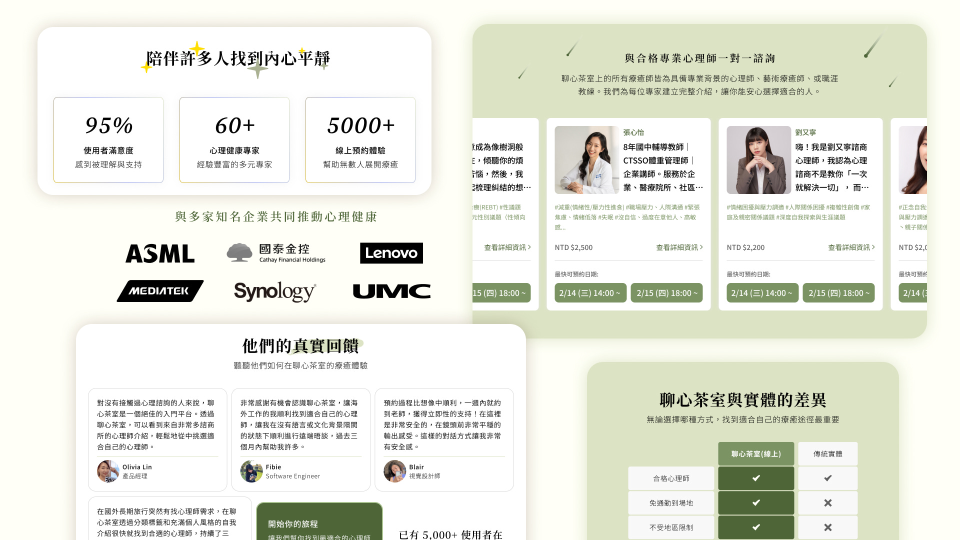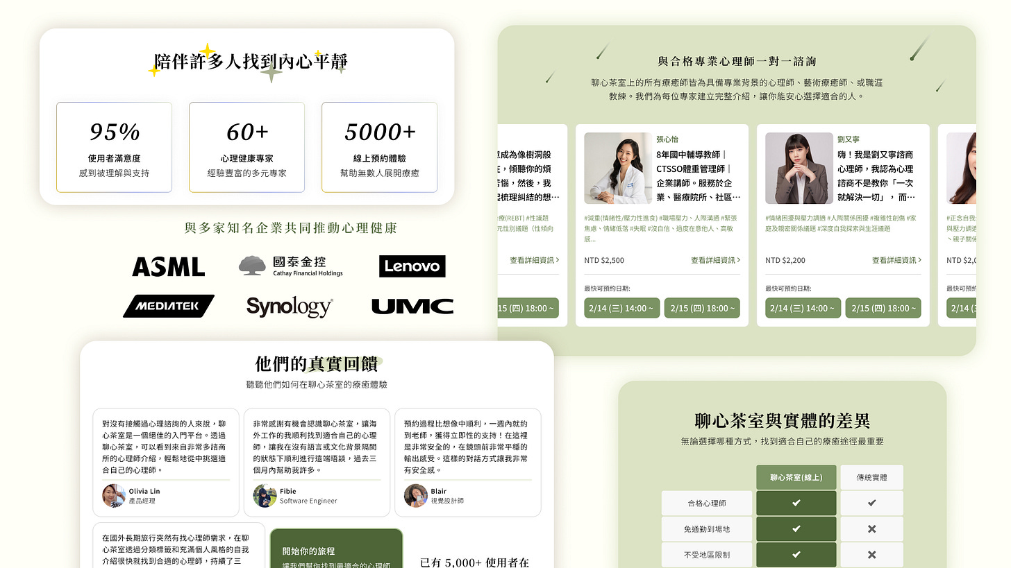 我在正職之外和幾個夥伴共同創辦了聊心茶室,一個讓使用者預約心理師視訊諮商的平台。我負責從零開始設計整個產品,從使用者研究、視覺風格、預約流程。上線之後,我們陸續做了一些改動,有些有效,有些完全沒有用。
