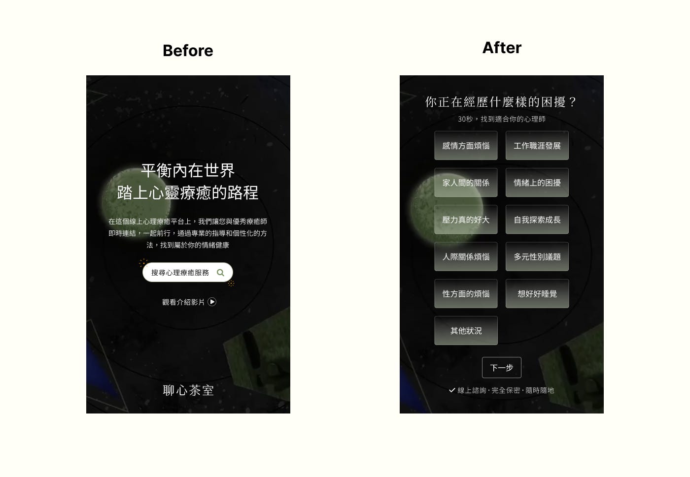 假設是:很多進來的人不知道我們是誰、不信任我們。所以我們加了數字、使用者推薦、更清楚的流程說明、首頁直接顯示心理師和可預約時間、加了 FAQ。